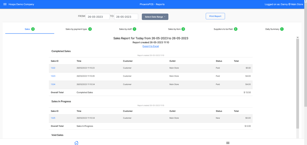 This is a smaple report that shows sales for the day - making it easy to cash up.